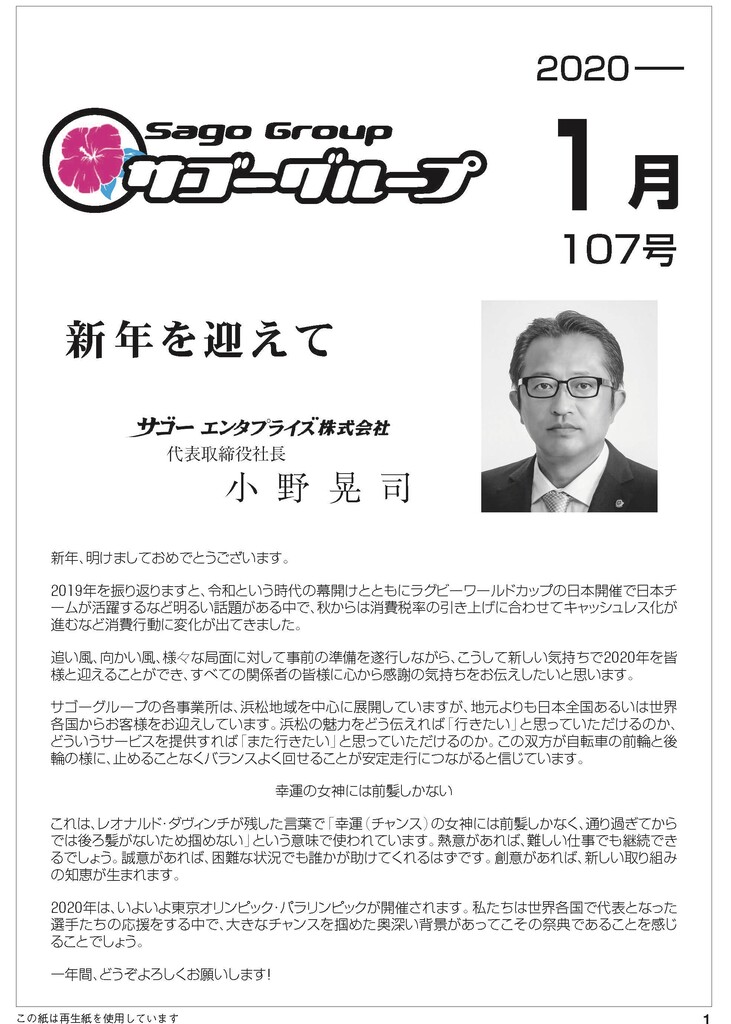 私の生活はサゴーグループ各社の「経営者」としての活動が軸となります。この2020年は、サゴーグループが未来志向で「令和時代に相応しい組織を目指す」といたしました。