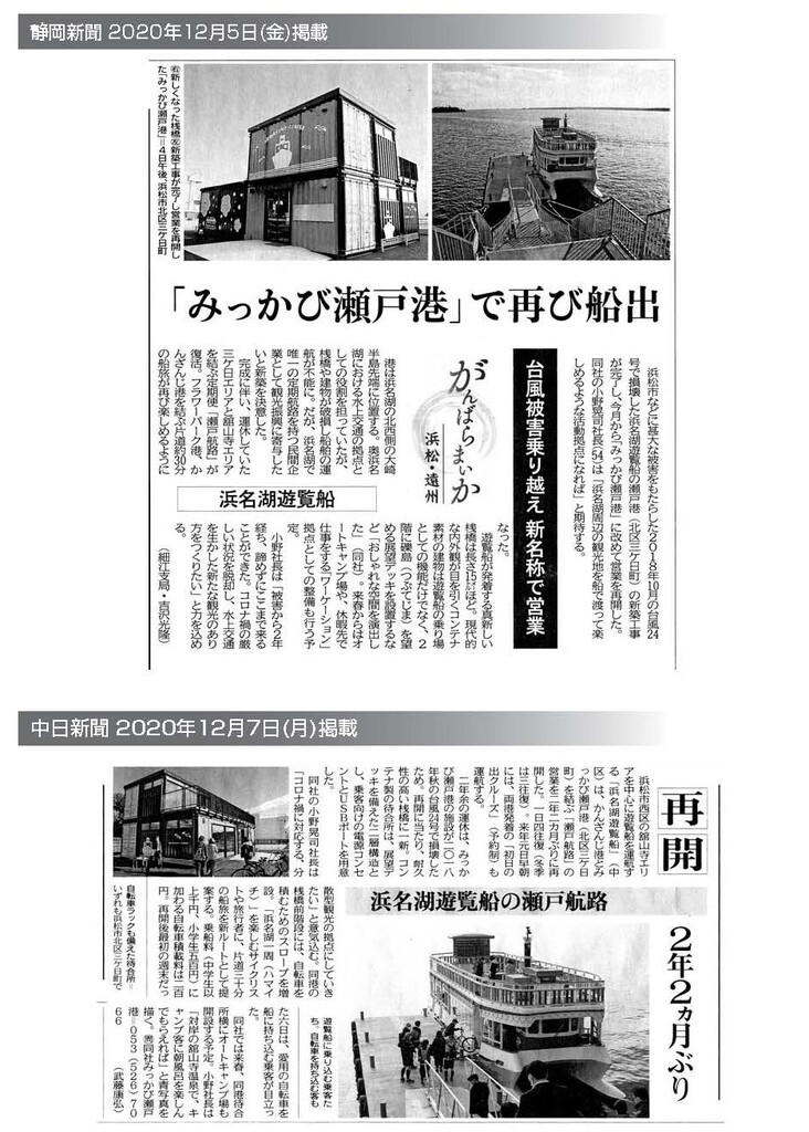 2021年12月1日(火)に舘山寺エリアと三ヶ日エリアを結ぶ瀬戸航路の運航を再開した浜名湖遊覧船の「みっかび瀬戸港」に関して、静岡新聞様と中日新聞様に記事として取り上げていただきました。