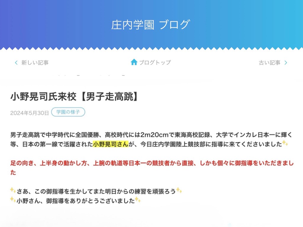 庄内学園での陸上指導。競技の基本は目的意識を持つことと反復継続すること。努力の成果は素直さにあり。 2024年06月05日 カテゴリ:小野晃司私的ダイアリ 最近、学校や陸上部の顧問から熱い要望があった場合のみ走高跳の技術指導をしています。 競技の基本は目的意識を持つことと反復継続すること。 写真は庄内学園ですが、私のような枯れた人間に機会を与えてくださる先生方に感謝しています。 タグ :#小野晃司#陸上競技 「小野晃司」カテゴリの最新記事 「私的ダイアリ」カテゴリの最新記事 人気記事ランキング コメント コメントする コメントフォーム 名前 コメント 評価する リセット リセット 顔 星 投稿する 情報を記憶